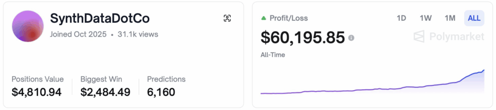 Synthdata has reported a remarkable performance milestone, revealing that its forecasting-driven strategy has officially 20×’d its initial capital in roughly two months. According to the team, it took only seven weeks to reach a 10× return on Polymarket, followed by just six additional days to double that figure. Starting with an initial $3,000 on October 3, Synthdata attributes the outsized gains to the strength and accuracy of its Synth-powered forecasts, which continue to demonstrate the potential of agentic prediction systems operating on Bittensor’s SN50.