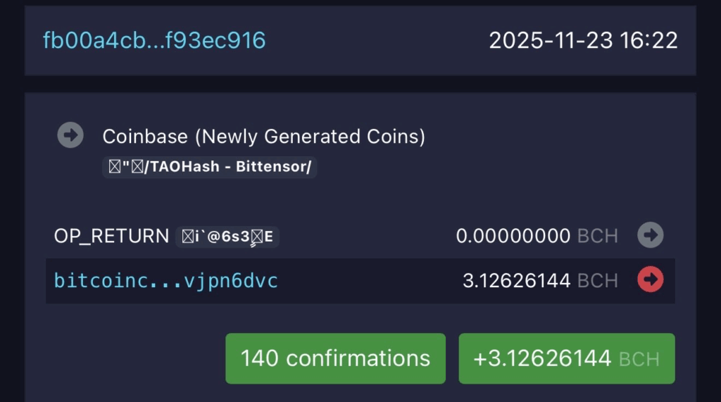 TaoHash has announced a significant breakthrough for Subnet 14, revealing that it successfully solo-mined an entire Bitcoin Cash (BCH) block – a rare achievement that highlights the subnet’s growing computational strength and efficiency. The accomplishment has been permanently recorded on the Bitcoin Cash blockchain, marking an important technical milestone for TaoHash and showcasing the potential of Bittensor-powered mining architectures operating at scale.