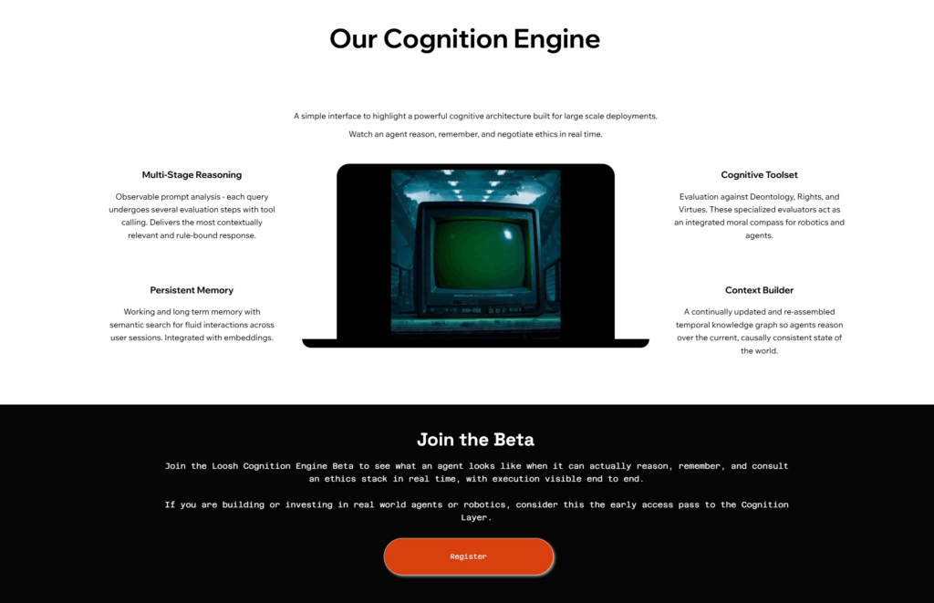Overall, Loosh positions its Cognition Engine as a foundational layer for autonomous agents and robotics, emphasizing transparency, inspectability, and ethical constraints as core design principles rather than afterthoughts.