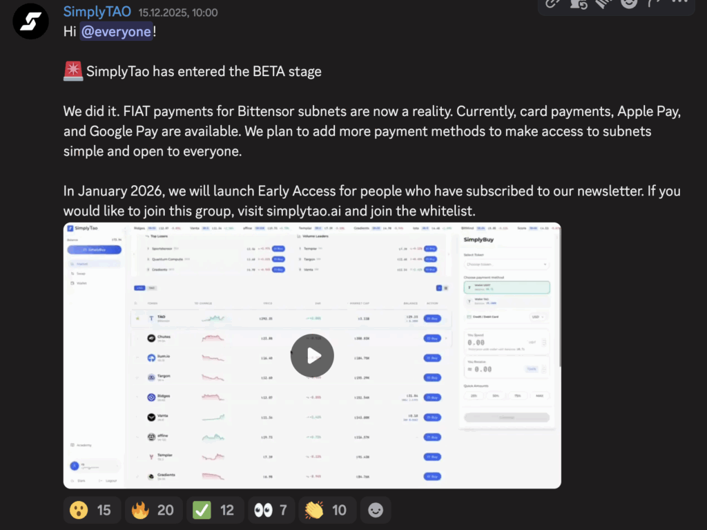 The platform now enables fiat payments for Bittensor subnets, making real-world access significantly easier. Users can already pay using card payments, Apple Pay, Google Pay, and Revolut Pay, with more payments methods coming soon to further lower the barrier to entry and open subnet participation to a broader audience.