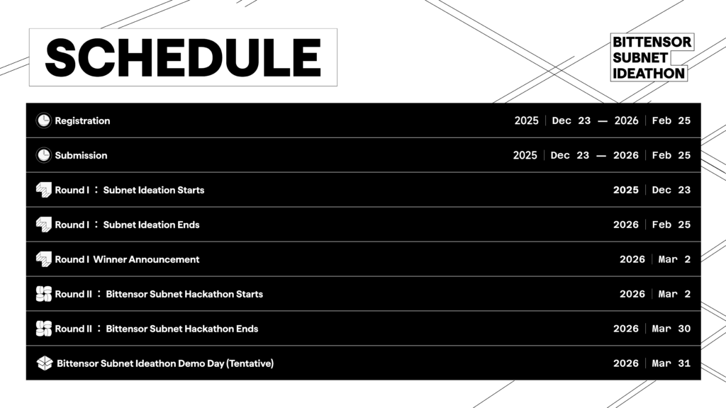 The competition runs in two rounds. Round One focuses on subnet design and closes February 25, 2026. Teams submit design proposals covering incentive mechanisms, miner and validator roles, and business strategy. No testnet deployment is required at this stage. Seven teams advance to Round Two, running March 2 through March 30, 2026. Selected participants must implement their proposals on the Bittensor testnet.
