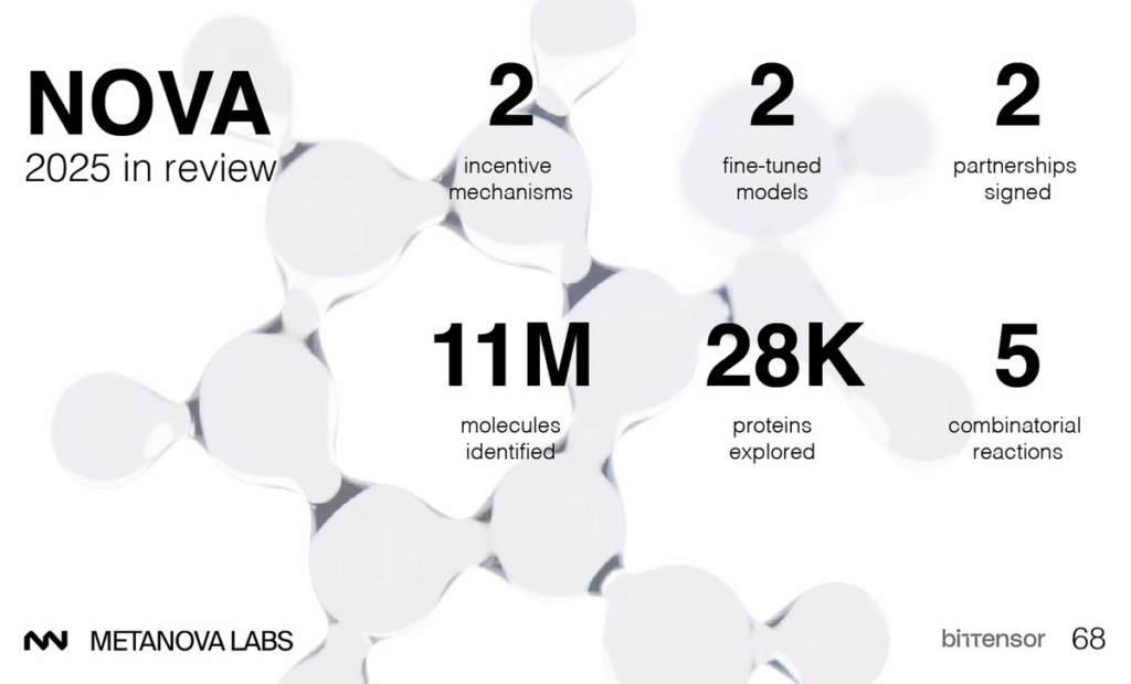 Metanova Labs published a year-in-review for NOVA, the drug screening platform operating on Bittensor Subnet 68. The system launched in March 2025 as what the team describes as the first decentralized drug discovery platform on the network.