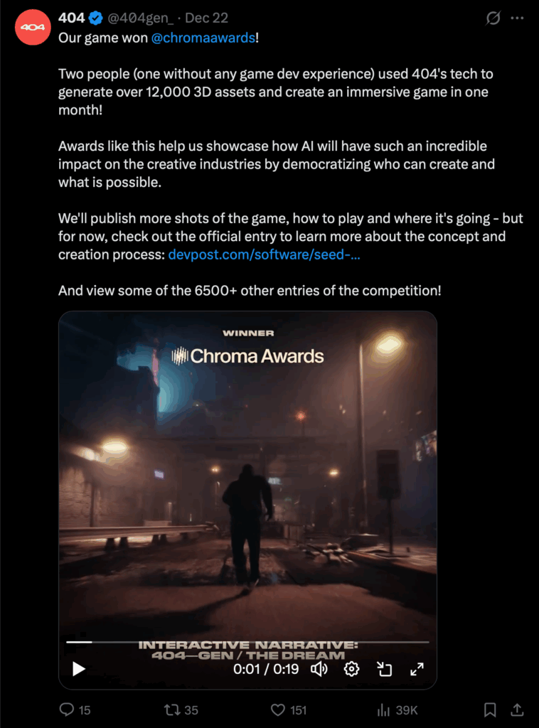 404 has announced that its game project has won a Chroma Awards competition. The win highlights the growing role of AI-driven tools in game development. The entry shows how generative technology can lower the barrier to complex, immersive digital experiences.