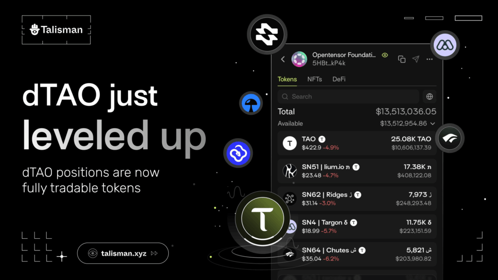Wallet app Talisman has shipped version 3.1.7, introducing a major change to dTAO: alpha positions are now fully tradable tokens at the account level. The update turns previously siloed positions into portable assets users can move, chart, and manage directly in-app.