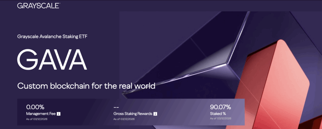The Grayscale Avalanche Staking ETF is officially live. On March 12, 2026, Grayscale Investments announced that its newest exchange-traded product began trading on NASDAQ under the ticker $GAVA. The fund offers regulated exposure to AVAX, the native token of the Avalanche network. It also integrates staking directly into the investment strategy, meaning investors benefit from network rewards without handling tokens themselves. On top of that, the product debuts with a promotional 0% management fee, making it one of the most competitively priced crypto ETF offerings available right now.