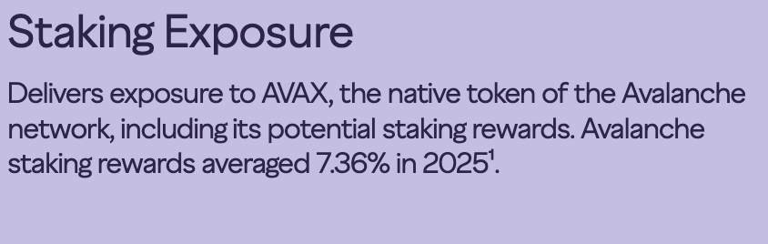 The fund stakes AVAX tokens through the Avalanche Proof of Stake network to earn staking rewards. However, these rewards are not paid directly to individual investors. Instead, the staking returns contribute to the fund’s overall net asset value (NAV) over time.