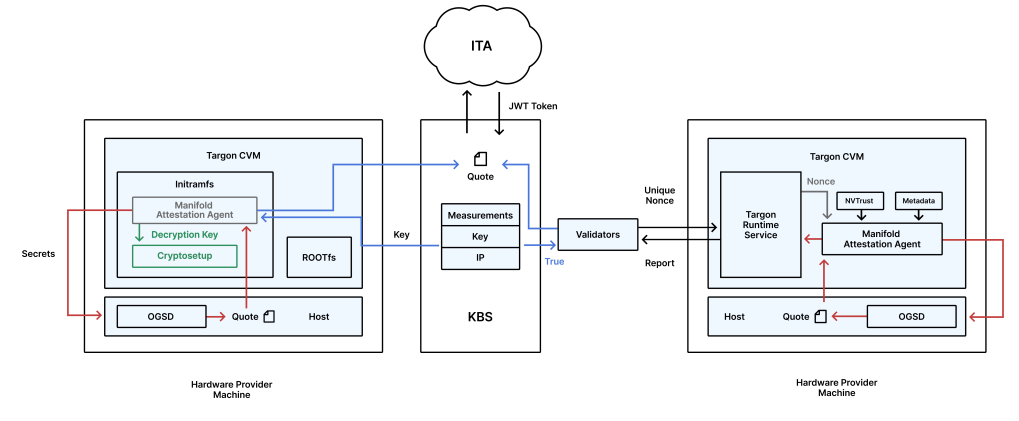 When a hardware provider joins the network, Targon’s Image Gateway generates a unique, encrypted Confidential Virtual Machine (CVM) based on a hardened Ubuntu 24.04 image. Each CVM receives a randomly generated per-VM disk encryption key stored in Intel’s Key Broker Service (KBS). The key is only released after the VM passes remote attestation through Intel Trust Authority.