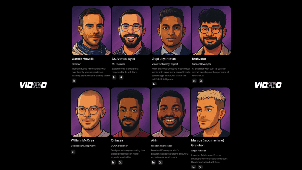 Vidaio is powered by a diverse team of experienced leaders, engineers, and designers focused on advancing decentralized video AI. Led by Gareth Howells, a veteran of the video industry, the team combines deep expertise in machine learning, video technology, subnet development, product design, and frontend engineering. With contributions from Dr. Ahmad Ayad, Gopi Jayaraman, Bruhvatar, William McCrea, Chinaza, Akin, and strategic guidance from Marcus (mogmachine) Graichen, Vidaio brings together technical excellence and creative vision to build scalable, decentralized solutions for video compression, upscaling, and future streaming infrastructure.