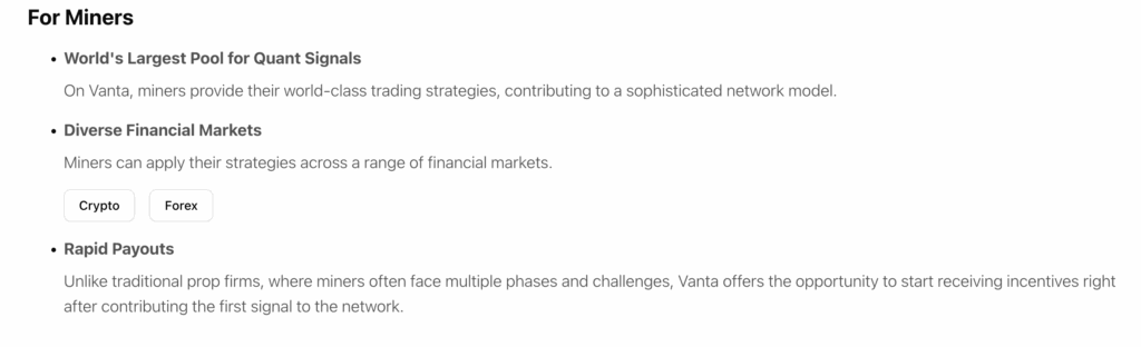 The competition is deliberately harsh. In fact, Taoshi, the team behind the project, describes Vanta (SN8) as the most challenging and competitive trading network in the world. Miners can deploy algorithmic strategies, deep learning models, or manual quant approaches depending on their expertise. However, only strategies that deliver consistent, risk-managed returns across dozens of supported trade pairs survive.