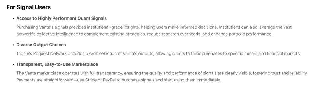 On the infrastructure side, the team has introduced a collateral system where top-performing miners deposit alpha tokens for funding. Profits then go toward buying back alpha, reinforcing token value. Complementary tools like the Vanta CLI streamline network interaction for both miners and validators. Additionally, auto-trading integration through partners like Glitch Financial allows users to act on the network’s signals without manual execution.